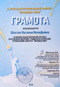 Грамотой «За высокое педагогическое мастерство и качественную подготовку ко II открытому региональному конкурсу «Вясновыя зоркі» награждена Шостак Наталья Иосифовна.